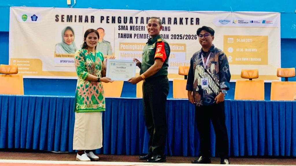 Sebagai bentuk penghargaan atas kontribusi dalam menyukseskan seminar ini, panitia memberikan sertifikat apresiasi kepada narasumber, Peltu Humam. Sertifikat diserahkan langsung oleh Ibu Ni Made Adnyani, S.Ag., M.Pd., selaku Wakil Kepala Sekolah Bidang Humas dan juga Ketua Panitia Seminar Penguatan Karakter.